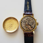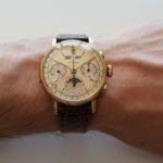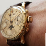 奇跡的にサブダイヤル、カレンダー、ムーンフェイズ、ストップ&スタート&リセットすべて完動状態です。マテリアルは18金無垢のイエローゴールド。ご多分に漏れず、メンテナンスに相当手が掛かる子ですが、ギャツビーなアールデコデザインに惚れたんだから仕方ない。。😅