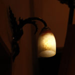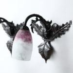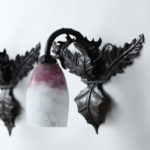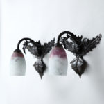ドーム兄弟のペア壁灯。年代はアールヌーヴォー期ですが、おおむねアールデコ様式の作品です。鍛鉄フレームは柊(ひいらぎ、英:Holly)の葉で凛としたノーブルな存在感です。