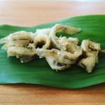DIYで作ってみた黒檀のマイ箸と桜板のランチョマットに、釣ってきた鯊を庭採れ葉蘭で盛り付け。たまにはモダンもいいモンダ。😋