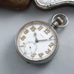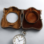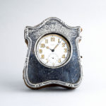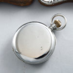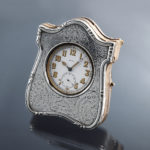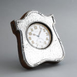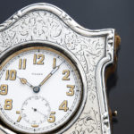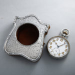 ゴリアテ(巨人)と呼ばれる大型のポケットウォッチ。時計本体が純銀のスタンドに収納できる珍しい仕組みです。直径6cm以上の大きな懐中時計が、ゴリアテ(Goliath)と呼ばれます。純銀ケースのレリーフがお洒落で可愛らしい逸品ではないでしょうか。スタンドケースはジェームズ・ディーキン&ソンズ社(James Deakin & Sons Ltd 1866~1940年 シェフィールド地方)が作成した物でヴィクトリア王朝期の彫刻様式への傾倒が色濃く見られます。懐中時計本体はランデロン社(スイス)のムーブメント搭載機で変わり種なお品ですが、出自はイギリスです。