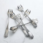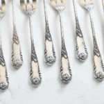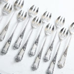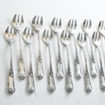 1890年代、フランスで作られたアールヌーヴォー様式のデザートフォーク12本セット。アールヌーヴォーを想わせる可憐な草花リーフが可愛らしいです。アールヌーヴォー期のシルバープレートは銀の皮膜が厚く本体も丈夫です。ホールスタンプがありますが字が潰れて読めませんから無銘品でお買い求め安い価格に設定してあります。普段使いで気にせず使いたい方にお薦めです。