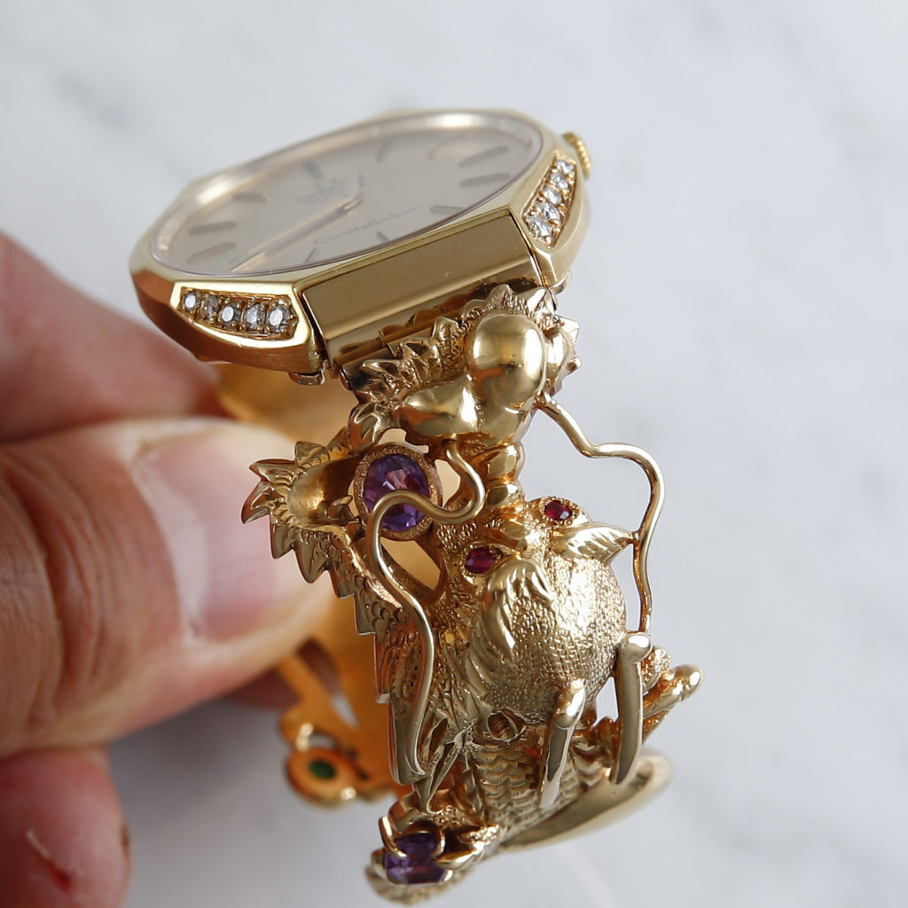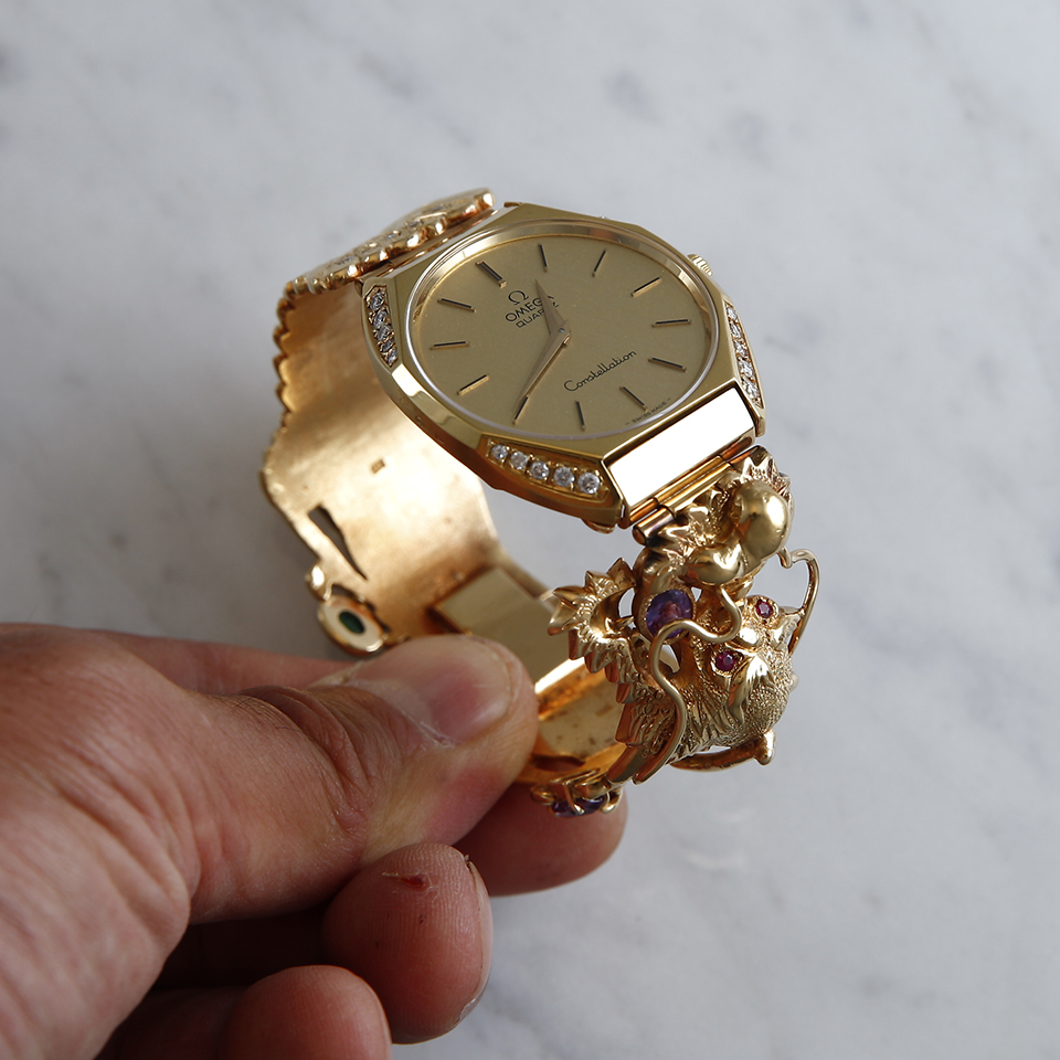 龍が如く。 オメガ コンステレーション(クォーツ)修理の依頼。 オメガ直製造の赤金ムーブですが回路が逝ってますね… こういう時は、さくっと交換っきゃない。 ダイヤモンド、ルビー、アメジスト、エメラルドでブレスカスタムオーダーがカルティエ的ですが、クライアントさんは99%カタギの人でした! こういう個性の塊、オンリーワンで我が道を行く人は好きですね。地味ヘンドリクスな僕には眩しすぎます。。![]()