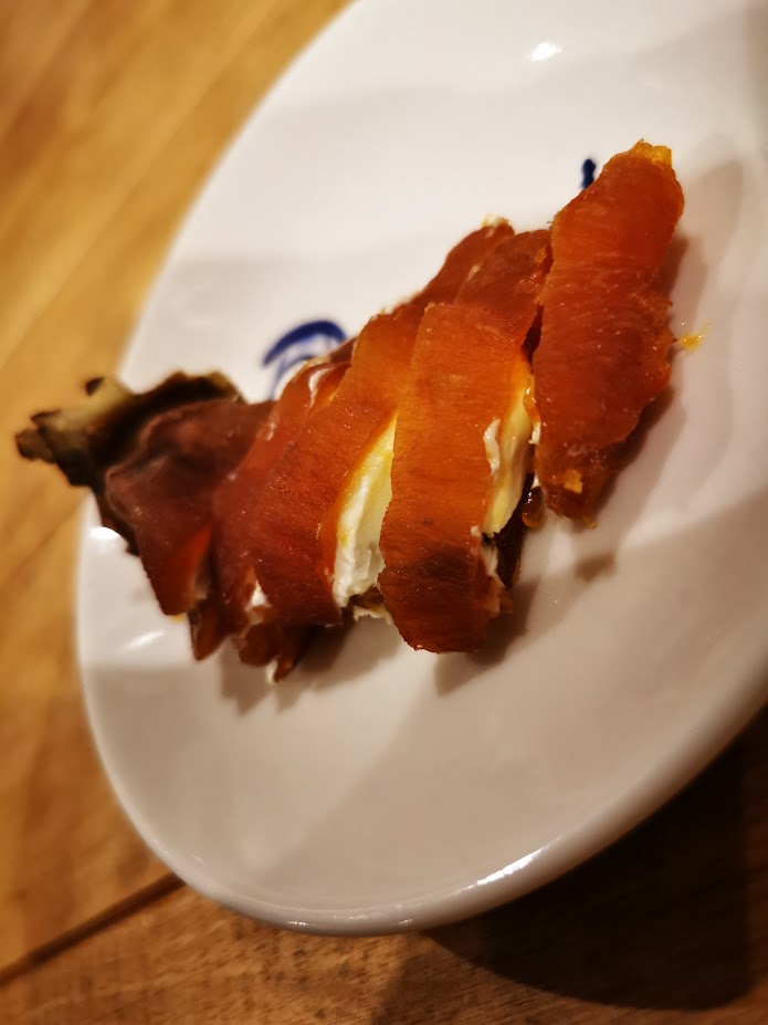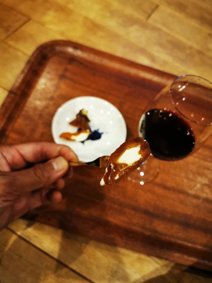 干し柿のフロマージュ 2024年10月22日 日々のこと 自作の干し柿とクリームチーズでフロマージュ作ってみた。🍷にとても合う😋 干し柿に切り込みを入れてタネを取り出してクリームチーズと、クルミなどナッツ類があれば一緒に仕込む。ブランデー、砂糖、塩を煮詰めて刷毛で外側をひと塗りして完成。