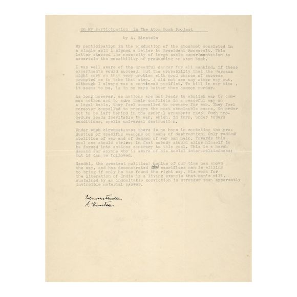 アインシュタインの原爆に関する最も力強い声明で、「原爆計画への私の参加について」のオリジナルタイプ原稿がボナムズオークション(ニューヨーク開催)に出品されます。
