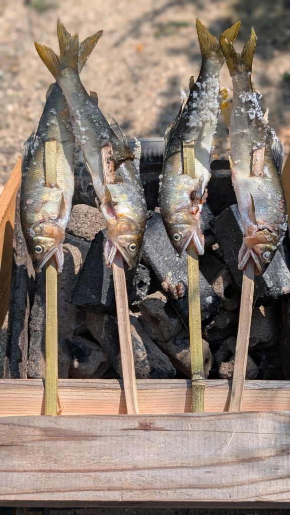 ↓炭火で綺麗に焼けるよう、鮎塩焼き専用の焼台作りました。
