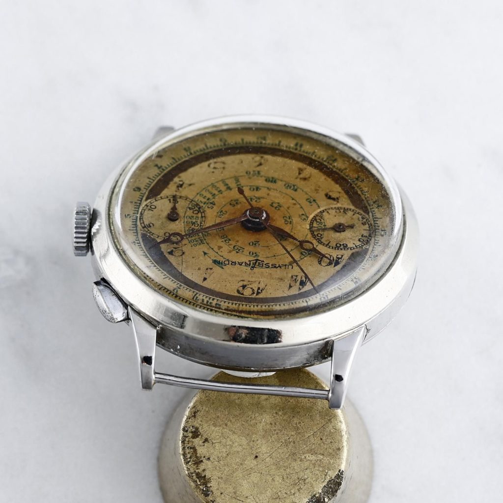 ユリス・ナルダン社でワンプッシャータイプのクロノグラフです。ランデロンハーンのクロノグラフ初期型Cal.15が搭載されていますので1935~1940年に製造された大変古い個体です。経年焼けしたダイヤルに掠れた英数字のインデックスにブレゲ針と渦模様のタキメーターがクラシカルで良い雰囲気です。外径39mmと大型の肉厚ケースなので、軍配給されたのかもしれません。