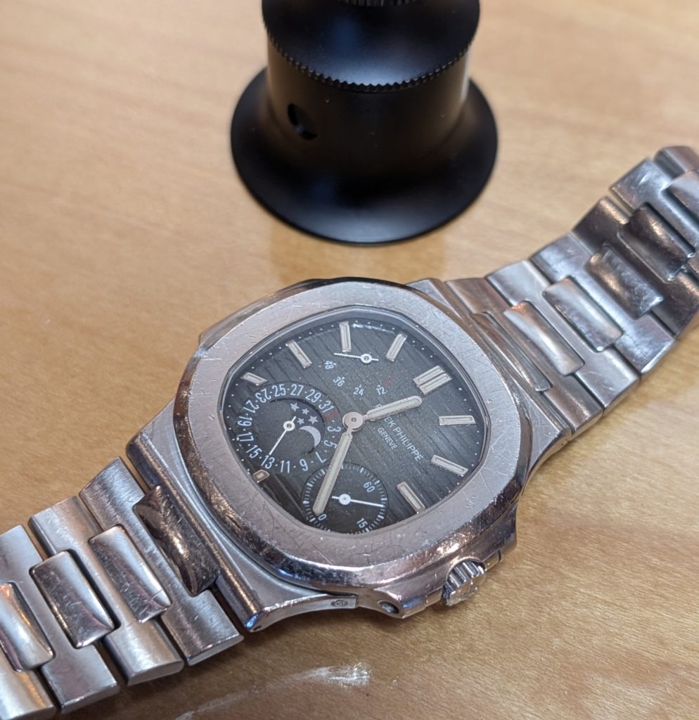 ⌚🛠️パテックノーチラスの修理依頼。竜頭ロックを忘れて温泉に浸水させてしまったそうです。とりあえずドライヤーがんがんあてて曇りは取れたらしいけど、このまま放置は危険なのでお持ち込みされた判断は正しくて素晴らしい。即分解してとりあえず炭酸水素ナトリウム水で中和洗浄しときます。しかしこの時計を普段使いって凄いですね🧐